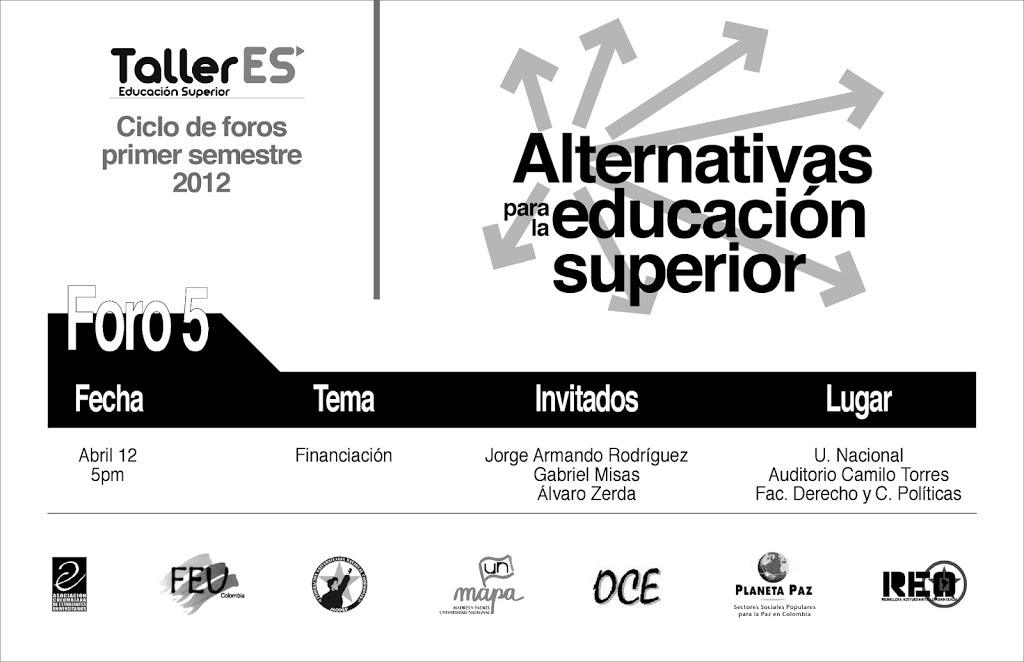 En el marco de la construcción de un nuevo modelo de educación para el país, la MANE a jugado un papel fundamental al detener el proyecto de ley educativo perverso del Gobierno nacional el semestre pasado. Ahora la MANE se propone generar uno distinto desde diversos sectores sociales, permitiendo tambien unificar en este historico proyecto al estudiantado nacional. De esta manera, diversas organizaciones estudiantiles invitan cordialmente al quinto foro de «Talleres» el cual versará en esta oportunidad sobre la «Financiación». Por una educación para un país con Soberania, Democracia y Paz, vamos TODOS a construír educación.