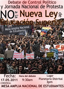 Mañana martes 17 de mayo en el senado de la república se hará un debate de control político contra la nueva ley de Educación Superior, a este debate que cita el Polo Democrático esta llamada la Ministra de Educación. En dicho debate el movimiento estudiantil tendrá la palabra en cabeza de 2 estudiantes quienes hablaran a nombre de la Mesa Amplia Nacional de Estudiantes -MANE-